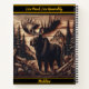 A striking moose relief carved into dark wood sits against a backdrop of trees and mountains, showcasing craftsmanship and nature's beauty.
