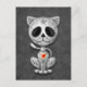 This adorable grey kitten design is decorated with swirls and dot patterns. Small flower pedals circle the pure black eyes in the tradition of the Day of the Dead sugar skulls. The cat is sitting down, looking forward with its tail waving in the background. The over sized head sits on a tiny body which creates a playful, cartoon like appearance. A five point star sits in the middle of the kitten’s forehead while a bright red and yellow heart appears in the centre of the chest. This cute little cat is a fun and stylish design inspired by the beautiful patterns of Day of the Dead sugar skulls.