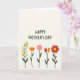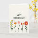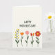This greeting card features a large, friendly message placed across the upper half, written in dark lettering that stands out against a light cream background. The open space around the words gives the design room to breathe, like a quiet pause before a warm hug ❤️. Below the text, five stylised flowers line up in a gentle row, their tidy shapes and soft outlines suggesting a sweet closeness, like friends walking side by side. The lineup starts with a branching stem dotted with small round yellow blooms, followed by a single orange cup-shaped flower. Next comes a soft pink many-petaled flower, then two tapered blossoms in deep red and orange that lean towards each other like they’re sharing a secret 🌼. Dark green stems and a few simple leaves connect the flowers into one calm, steady rhythm. The final bloom is a full scarlet flower with a bright yellow centre, sitting at the far right of the row.