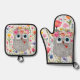 Darling Pink Crown Floral Owl Oven Mitt & Pot Holder Set