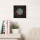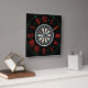 This wall clock displays a small dartboard like design in the centre with style and look plus black, red and green colours with numbers around the outside in this gameroom/cave lover theme inside of red Roman numeral numbers with red & green accents. This clock is made for any wall and printed with a AcryliPrint®HD process measures 10.75" x 10.75" and made from grade-A acrylic. Battery operated uses one AA battery for Indoor use only, not recommended for outdoor use.