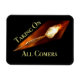 Just for those who like to play darts, this design has a flying dart with its tail on fire and the text Taking on All Comers.