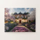 Dieses Puzzle zeigt ein atemberaubendes Traumhaus, umgeben von einem üppigen Garten voller farbenfroher Blumen und Pflanzen.