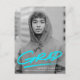 Modern graduation party invitation postcards featuring the graduate's vertical senior photo with "Grad" in turquoise handwritten lettering with an underline dash below. Personalise the front of the photo graduation party postcard by adding the graduate's name, school name, and graduation year. The postcard reverses to display your return address and graduation party details.