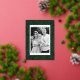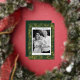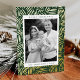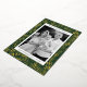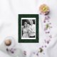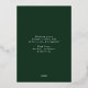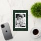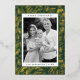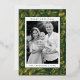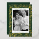 Modern holiday card featuring your photo framed in white with a green and gold foil dashed geometric pattern. Personalise the foil holiday card with your custom greeting, family name, and year in bold pine green lettering. The unique Christmas card reverses to display your custom message in white lettering with a pine green background.