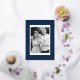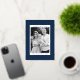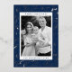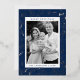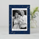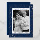 Modern holiday card featuring your photo framed in white with a navy and silver foil dashed geometric pattern. Personalise the foil holiday card with your custom greeting, family name, and year in bold navy lettering. The unique Christmas card reverses to display your custom message in white lettering with a navy background.