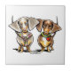 Two piebald dappled Dachshunds sporting stylish heart collar and pink camouflage harness. Original illustration by Andie of Off-Leash Art.