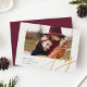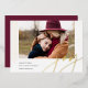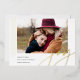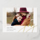 A modern and elegant holiday card featuring a horizontal or landscape-oriented photo accented with thin vertical foil stripes. "Joy" appears beneath in casual hand lettered gold foil script typography. Personalize with your custom holiday greeting, family name, and the year. A chic and modern minimalist choice for your Christmas 2022 cards.