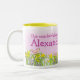 Fun girl in a field chasing birds custom name mug. Personalise with your daughters name. This example reads: Our wonderful daughter Alexandra.