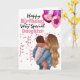 A beautiful illustration of a woman with long blonde hair holding a brunette haired child in her arms is surrounded by soft pink confetti ribbons and has a bunch of purple and fuchsia coloured balloons floating above her. The words, happy birthday to a very special daughter (which may be changed to granddaughter, niece, godchild etc) appears on a white background. The inside has a lovely tender message which should be customised to suit whatever family relation you have inserted on the front.
