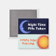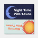 Colourful square magnet made as a medication reminder.  The magnet is done half in dark blue and half in light aqua blue, with a moon on the dark side and a sun on the opposite side.  White text on the moon side reads Night Time Pills Taken, and flip it over and it reads, Morning Pills Taken, on the sun side of the magnet.  Makes it a lot easier to remember if you took your meds and a great little gift for older seniors who tend to forget.