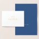 Foil front is simple border and classic typography; reverses to shield element with the name of the couple and date. Inside has a customisable colour, a classic navy blue hue is chosen for this card.