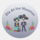 These custom Dia de los Muertos stickers feature a colourful illustrated design. An image of a skeleton couple and a cat printed in a sugar skull pattern are placed at the bottom. Beautiful colourful flowers are printed on either side of the Day of the Dead couple and their cat.