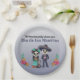 These custom Dia de los Muertos celebration plates feature a colourful illustrated design. An image of a skeleton couple and a cat printed in a sugar skull pattern are placed at the bottom. Beautiful colourful flowers are printed on either side of the Day of the Dead couple and their cat.