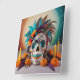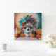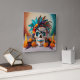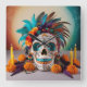 Vibrant skull sculpture in mixed media, adorned with delicate sugar skull-inspired decorations, lavish feathers, and beads, boasting intricate, swirling patterns and minute hieroglyphics, blending ancient mysticism with modern flamboyance, evoking a sense of mystique and celebration; a kaleidoscope of colours bursts forth, with radiant turquoise, sunset oranges, and emerald greens mingling in harmony, against a subtle, gradient background that transitions from creamy ivory to deep indigo, surrounded by whimsical marigolds and dainty candles.