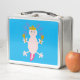 This awesome lunchbox features a digital art image of a cute axolotl, a Mexican Salamander, wearing a sombrero and shaking maracas. The axolotl is pale pink with bright pink feathery gills and a bright pink tail. It has huge eyes and a smile on its face. The sombrero is yellow with a green cactus in the middle. The cactus is surrounded by chilies and Mexican sunflowers, also called Tithonia. The Maracas are yellow with red and green flowers and wavy lines on them. There is custom text on the back so you can include a name.