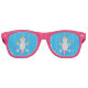 This awesome pair of party shades features a digital art image of a cute axolotl, a Mexican Salamander, wearing a sombrero and shaking maracas. The axolotl is pale pink with bright pink feathery gills and a bright pink tail. It has huge eyes and a smile on its face. The sombrero is yellow with a green cactus in the middle. The cactus is surrounded by chilies and Mexican sunflowers, also called Tithonia. The Maracas are yellow with red and green flowers and wavy lines on them.