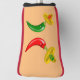 This awesome golf putter cover features a pair of chilis, a red chilli and a green chilli. They both have black eyes and pink mouths. Each Chilli is wearing a sombrero hat that has a skull of the opposite colour to the chilli on it in celebration of the Mexican Day of the Dead festival, Dia De Los Muertos. The sombrero also contains three flowers with alternating red and green petals representing the flag of Mexico.