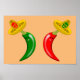 This awesome poster features a pair of chilis, a red chilli and a green chilli. They both have black eyes and pink mouths. Each Chilli is wearing a sombrero hat that has a skull of the opposite colour to the chilli on it in celebration of the Mexican Day of the Dead festival, Dia De Los Muertos. The sombrero also contains three flowers with alternating red and green petals representing the flag of Mexico.