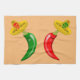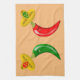 This awesome kitchen towel features a pair of chilis, a red chilli and a green chilli. They both have black eyes and pink mouths. Each Chilli is wearing a sombrero hat that has a skull of the opposite colour to the chilli on it in celebration of the Mexican Day of the Dead festival, Dia De Los Muertos. The sombrero also contains three flowers with alternating red and green petals representing the flag of Mexico.