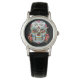 Women’s class black leather strap watch with an image of a Day of the Dead skull decorated with pink flowers and vines, red roses and a cross with four drops of blood on black. The Day of the Dead, or All Souls' Day, is celebrated on November 2 in various European and Latin American countries. In Mexico, the period of All Souls' Day festivities is held for several days, including All Saints' Day on November 1. See matching round button, square charm, drop earrings, large square premium metal keychain, round basic button keychain, swirl metal keychain and round necklace. See the entire Mexico Watch collection in the ACCESSORIES section.