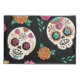This pillow case has a colourful Dia de los Muertos or Day or the Dead theme over a black background. Two sugar skulls are accented with pink and orange flowers, and floral greenery.