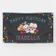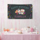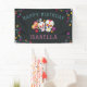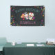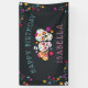 Celebrate a special birthday with this cool personalised banner, featuring "happy birthday [name]" on a dark off-black background adorned with colourful flowers, intricately decorated sugar skulls, and maracas. Designed to coordinate with our Dia de los Muertos birthday party invitations for Day of the Dead theme or Halloween season birthday parties.