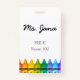 Featuring a lined notebook background and a vibrant crayon border, this badge is perfect for preschool and elementary educators. Personalise it with your name, grade level, and room number to create a fun and professional look that helps students, parents, and staff feel instantly connected.