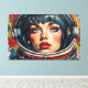 Otis Porritt's digital artwork presents a striking close-up of a woman's face, framed within the reflective visor of an astronaut's helmet. Her intense blue eyes, adorned with long lashes, and delicate freckles draw the viewer in, contrasted by vibrant red lips. The piece is rendered with bold, expressive strokes that mimic a rich impasto texture, creating a dynamic visual surface. A vivid palette of deep blues, bright yellows, and fiery reds dominates, with a playful polka-dot pattern animating the background, enhancing the work's energetic and captivating presence.