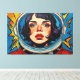 Otis Porritt's digital artwork presents a striking close-up of a woman's face, framed within the reflective visor of an astronaut's helmet. Her intense blue eyes, adorned with long lashes, and delicate freckles draw the viewer in, contrasted by vibrant red lips. The piece is rendered with bold, expressive strokes that mimic a rich impasto texture, creating a dynamic visual surface. A vivid palette of deep blues, bright yellows, and fiery reds dominates, with a playful polka-dot pattern animating the background, enhancing the work's energetic and captivating presence.