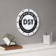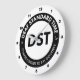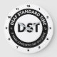 DST is in the middle of a white circle. On the outer ring in solid black is the text at the top, "Deaf Standard Time," and at the bottom, "It takes longer to say goodbye." The numbers 1-12 are in black bold on the edges of the design.