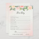 This baby shower game card features beautiful soft pastel watercolor roses and peonies in shades of blush pink and peach with lush green botanical leaves and eucalyptus.