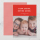 This cute, funny holiday photo card features a festive red background, simple white type, and a single photo. The greeting reads "Dear Santa, define good." This design would also be perfect for a pet card, but also works great for mischievous adults! The backer features a simple red and white diagonal stripe patter that can be customised or removed. To customise this design further, you could remove the backer pattern in favour of another photo or additional text.