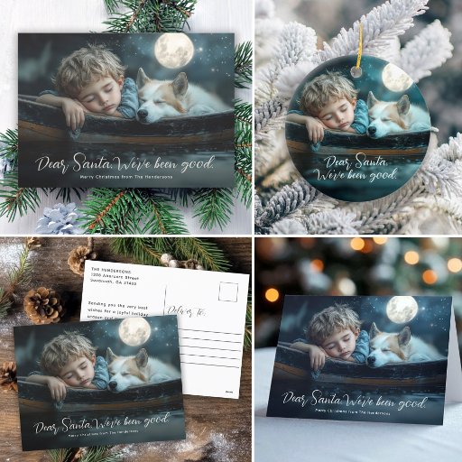 An adorable holiday photo card to personalise with a favourite family photo, this card features a modern handwritten script message to Santa on the front saying "Dear Santa, we've been good" followed by a Merry Christmas greeting and family name. The back of the card has an additional Christmas message for your friends and family. This card uses a pet photo, but you can select any favourite photo to use for your card. Cards may be ordered in both printed for mailing and instant download digital formats for sending electronically.