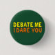 Debate me, I dare you. A confident speech and debate team quote by an opinionated person who can argue their way through any oration discussion or competition. Cool bright yellow and orange text on this orator humour button for a public speaker. Have the confidence that you will win any argument.