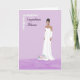 Debutante congratulations card in a light lavender with a black young lady in a long white gown, and a spray of white hearts in the upper left corner. Thanks to the Hungryjpeg for some of the elements in the design.