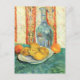 A fine art postcard with Vincent van Gogh's post-impressionist painting, who was a Dutch artist, Still Life with Decanter and Lemons on a Plate (1887). A table set with a glass carafe and fruit on a dish against a wallpaper background.