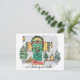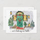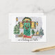 This festive holiday themed moving announcement features decorated front door with wreath, tree, winter decor, and script text "we're decking new halls" underneath. Personalise with your custom text and address on the back.