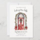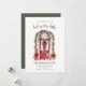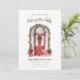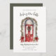Decking New Halls, moving announcement holiday card. Festive red watercolor door with Christmas decor.