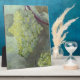 The painting depicts a cluster of grapes in shades of yellow and green, hanging from a vine. The grapes appear plump and translucent, catching light that enhances their fresh, juicy appearance. The leaves surrounding the cluster are a vibrant green, with delicate veins visible, adding depth to the scene. The background is softly blurred, bringing the focus to the grapes and giving the image a sense of calm and ripeness, as though it is a warm late summer day. The colours are soft, natural, and evoke a sense of abundance