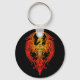 This red and yellow phoenix design is decorated with flowing tribal swirls and dot patterns. The symmetrical wings extend out from each side of the pattern while the tail falls down the centre forming a point at the base. The bold lines are highlighted which creates a subtle shine on the surface. This aggressive yet elegant phoenix sits on a pure black background which creates a beautiful and stylish keychain design.