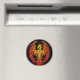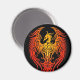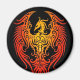 This red and yellow phoenix design is decorated with flowing tribal swirls and dot patterns. The symmetrical wings extend out from each side of the pattern while the tail falls down the centre forming a point at the base. The bold lines are highlighted which creates a subtle shine on the surface. This aggressive yet elegant phoenix sits on a pure black background which creates a beautiful and stylish magnet design.