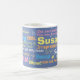 Personal mug decorated with the owners name. Mug that has a decoration of the owner's name with complimentary words and phrases. Personalise it! Example name is Susan.