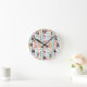 This wall clock has a mid-century modern design of circles and ovals strung together in retro colours strung together on a field of white.