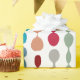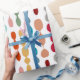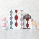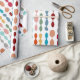 This wrapping paper has a mid-century modern design of circles and ovals strung together in retro colours strung together on a field of white.