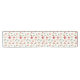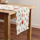 This pretty Holiday table runner has a repeating pattern of red, gold, and green decorative Christmas tree bulbs, along with evergreen pine needle twigs. The images are placed on a white background. Bright and colorful!
