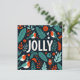 Minimalist holiday card design with a Scandinavian-inspired theme. The card features a simple green and red colour palette, with intricate, stylised illustrations of holly berries and abstract plants, arranged in a harmonious and balanced layout around a central text box. The central box has a clean, modern font with the message "Jolly" The design evokes a natural, festive feel with elegant, hand-drawn details, capturing a modern yet timeless aesthetic.