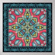 Decorative colourful ornament on a black background, symmetric pattern with doodle lace frame. Tribal ethnic mandala decor. Bandanna shawl, tablecloth fabric print, silk neck scarf, kerchief design