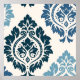 A vintage influenced decorative damask art print in a modern style in mid-blue, dark blue and light blue detail on a light cream color background.