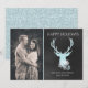Stylish, rustic, flat holiday greeting card done in a charcoal grey chalkboard look, on the right, and a custom photo on the left side. Graphics of an aquamarine deer head, with aqua glitter looking antlers, decorates the chalkboard side of the card. Pretty white and aquamarine coloured snowflakes decorate the bottom of the deer. Personalise the white text fields to suit your Christmas card needs.